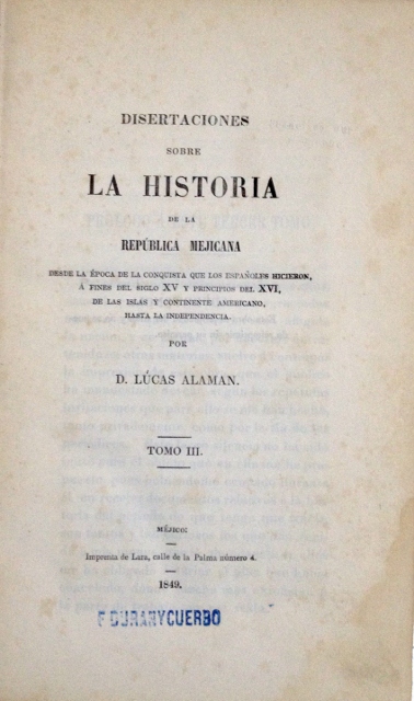 DISERTACIONES SOBRE LA HISTORIA DE LA REPUBLICA MEJICANA. DESDE LA EPOCA DE LA CONQUISTA QUE LOS ESPAÑOLES HICIERON A FINES DEL SIGLO XV Y PRINCIPIOS DEL XVI, DE LAS ISLAS Y CONTINENTE AMERICANO, HASTA LA INDEPENDENCIA. TOMO III