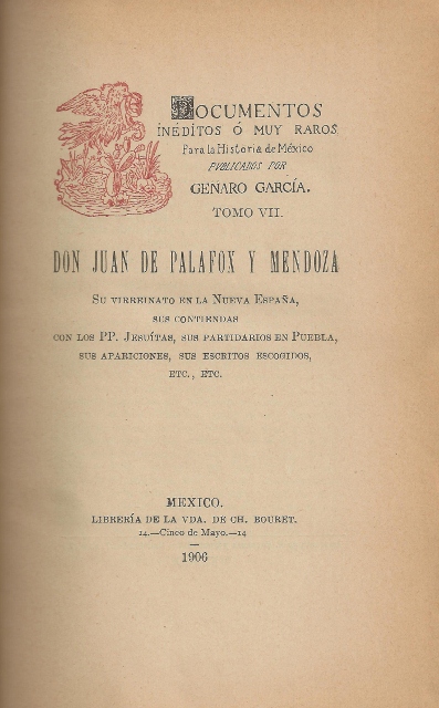 DOCUMENTOS INEDITOS O MUY RAROS PARA LA HISTORIA DE MEXICO. TOMO VII. DON JUAN DE PALAFOX Y MENDOZA. SU VIRREINATO EN LA NUEVA ESPAÑA, SUS CONTIENDAS CON LOS PP. JESUITAS, SUS PARTIDARIOS EN PUEBLA, SUS APARICIONES, SUS ESCRITOS ESCOGIDOS, ETC., ETC.