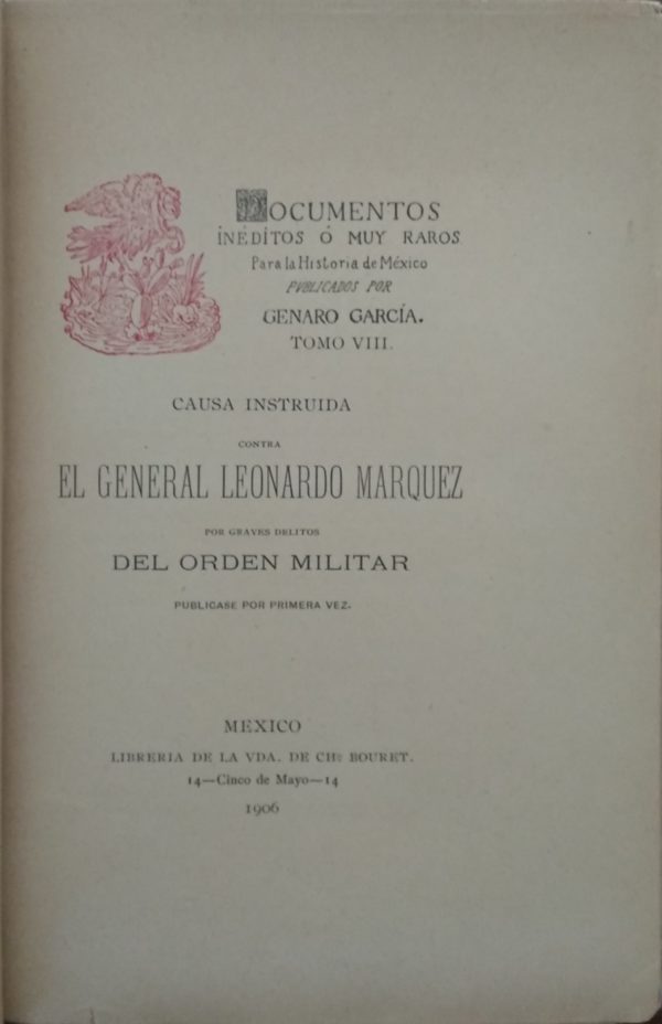 DOCUMENTOS INEDITOS O MUY RAROS PARA LA HISTORIA DE MEXICO. TOMO VIII. CAUSA INSTRUIDA CONTRA EL GENERAL LEONARDO MARQUEZ POR GRAVES DELITOS DEL ORDEN MILITAR. PUBLICASE POR PRIMERA VEZ.