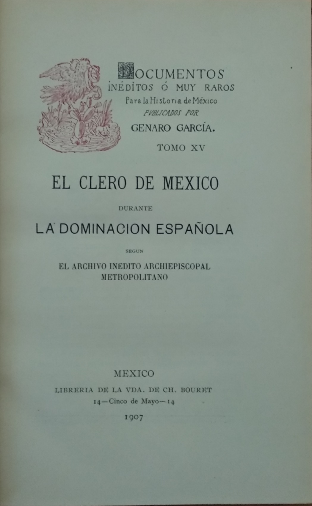 DOCUMENTOS INEDITOS O MUY RAROS PARA LA HISTORIA DE MEXICO. TOMO XV. EL CLERO EN MEXICO DURANTE LA DOMINACION ESPAÑOLA SEGUN EL ARCHIVO INEDITO ARCHIEPISCOPAL METROPOLITANO.