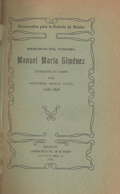 DOCUMENTOS INEDITOS O MUY RAROS PARA LA HISTORIA DE MEXICO. TOMO XXXIV. MEMORIAS DEL CORONEL MANUEL MARIA GIMENEZ. AYUDANTE DE CAMPO DEL GENERAL SANTA ANNA 1798-1878