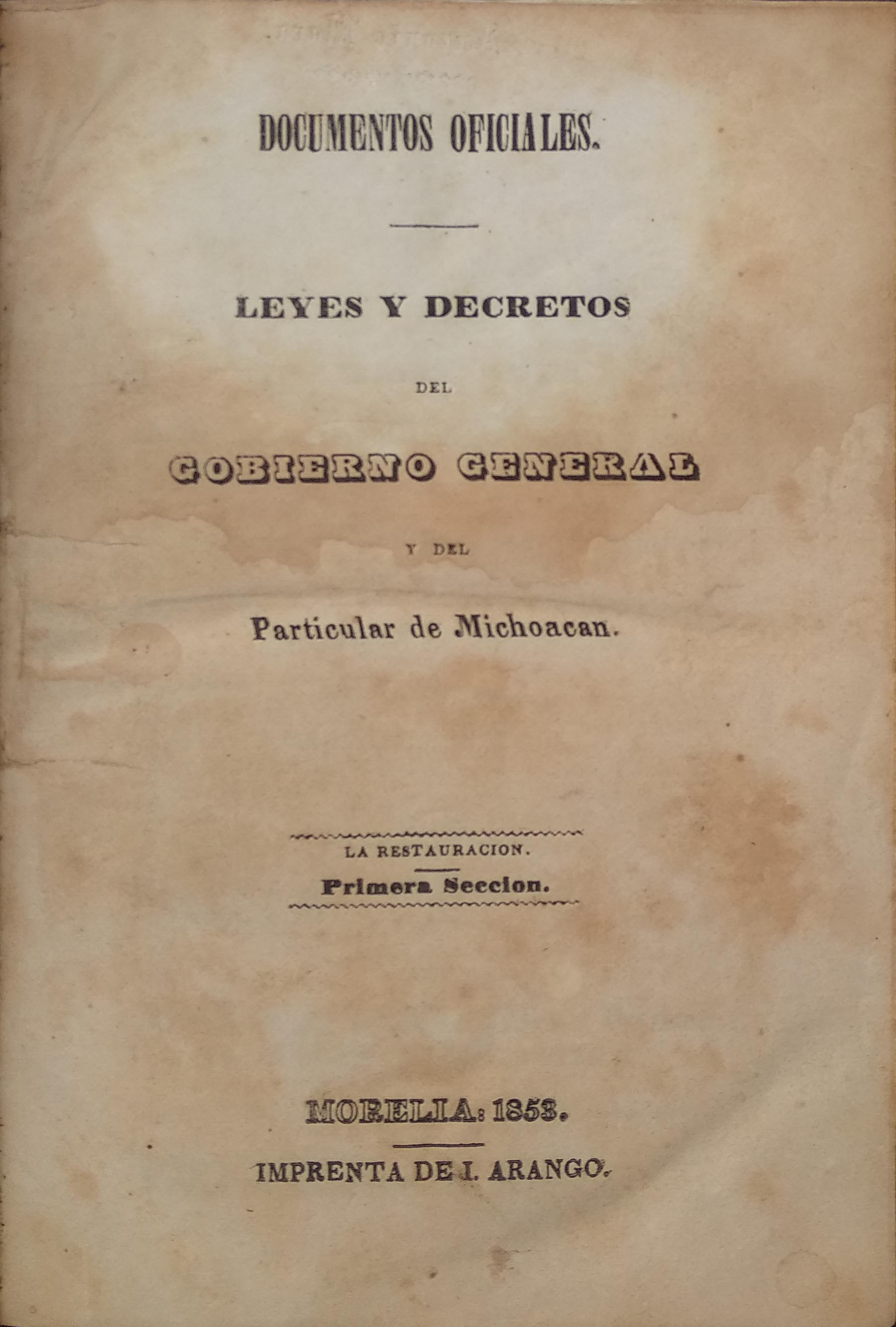 DOCUMENTOS OFICIALES. LEYES Y DECRETOS DEL GOBIERNO GENERAL Y DEL PARTICULAR DE MICHOACAN (TOMO I)