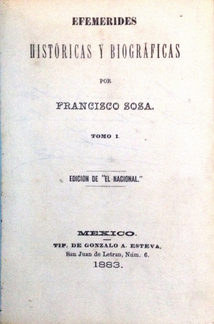 AUTOR: SOSA (FRANCISCO)EDITOR: TIP. DE GONZALO A. ESTEVAEDICIÓN: S. E.AÑO: 1883LUGAR: S. L.PAÍS: MEXICOPÁGINAS: 510 PP.TEMARIO: ANTIGUO. PORFIRIO DIAZID: 13.06