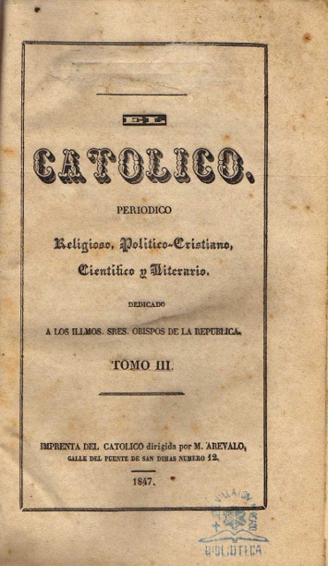 EL CATOLICO. PERIODICO RELIGIOSO, POLITICO-CRISTIANO, CIENTIFICO Y LITERARIO DEDICADO A LOS ILLMOS. SRES. OBISPOS DE LA REPUBLICA. TOMO III (NUM. 1 – 26). Y 2A. SERIE. TOMO I (NUM. 1 – 5)