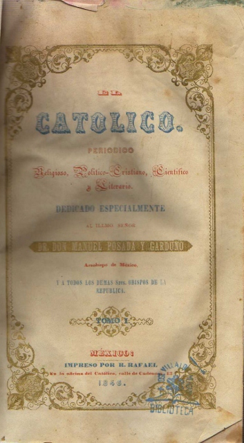 EL CATOLICO. PERIODICO RELIGIOSO, POLITICO-CRISTIANO, CIENTIFICO Y LITERARIO DEDICADO ESPECIALMENTE AL ILLMO. DR DON MANUEL POSADA Y GARDUÑO ARZOBISPO DE MEXICO, Y A TODOS LOS DEMAS SRES, OBISPOS DE LA REPUBLICA. TOMO I. NUM. 1 – 26.