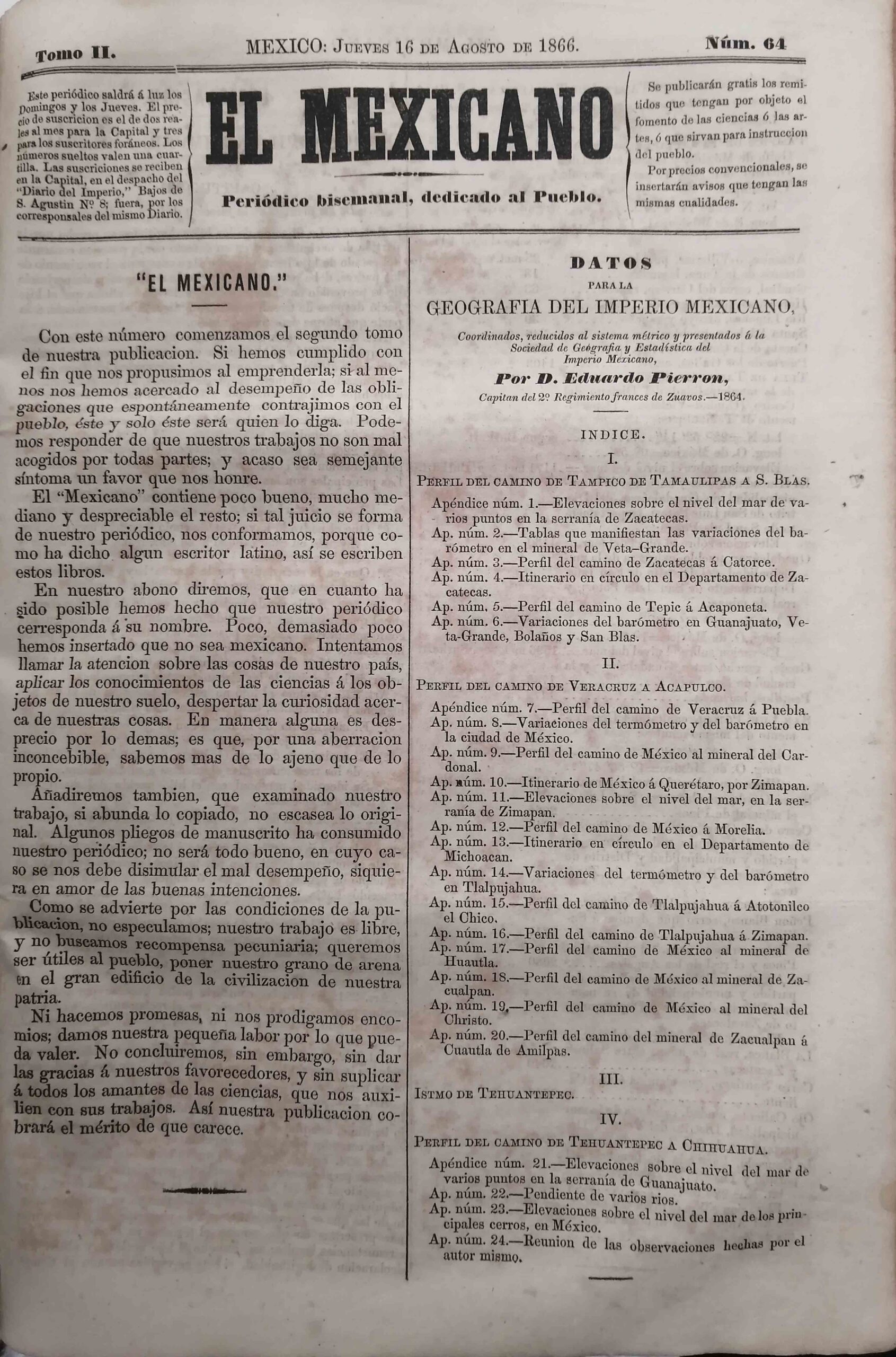 EL MEXICANO. PERIODICO BISEMANAL, DEDICADO AL PUEBLO. NUM. 64 AL 95 (16 DE AGOSTO AL 2 DE DICIEMBRE DE 1866).