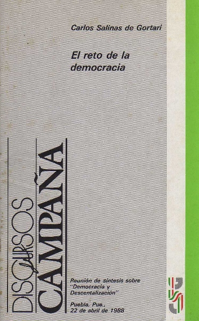 AUTOR: SALINAS DE GORTARI (CARLOS)EDITOR: DISCURSOS DE CAMPAÑAEDICIÓN: S. E.AÑO: 1988LUGAR: PUEBLA, PUE.PAÍS: S. P.PÁGINAS: 23 PP.TEMARIO: DERECHOID: 3095