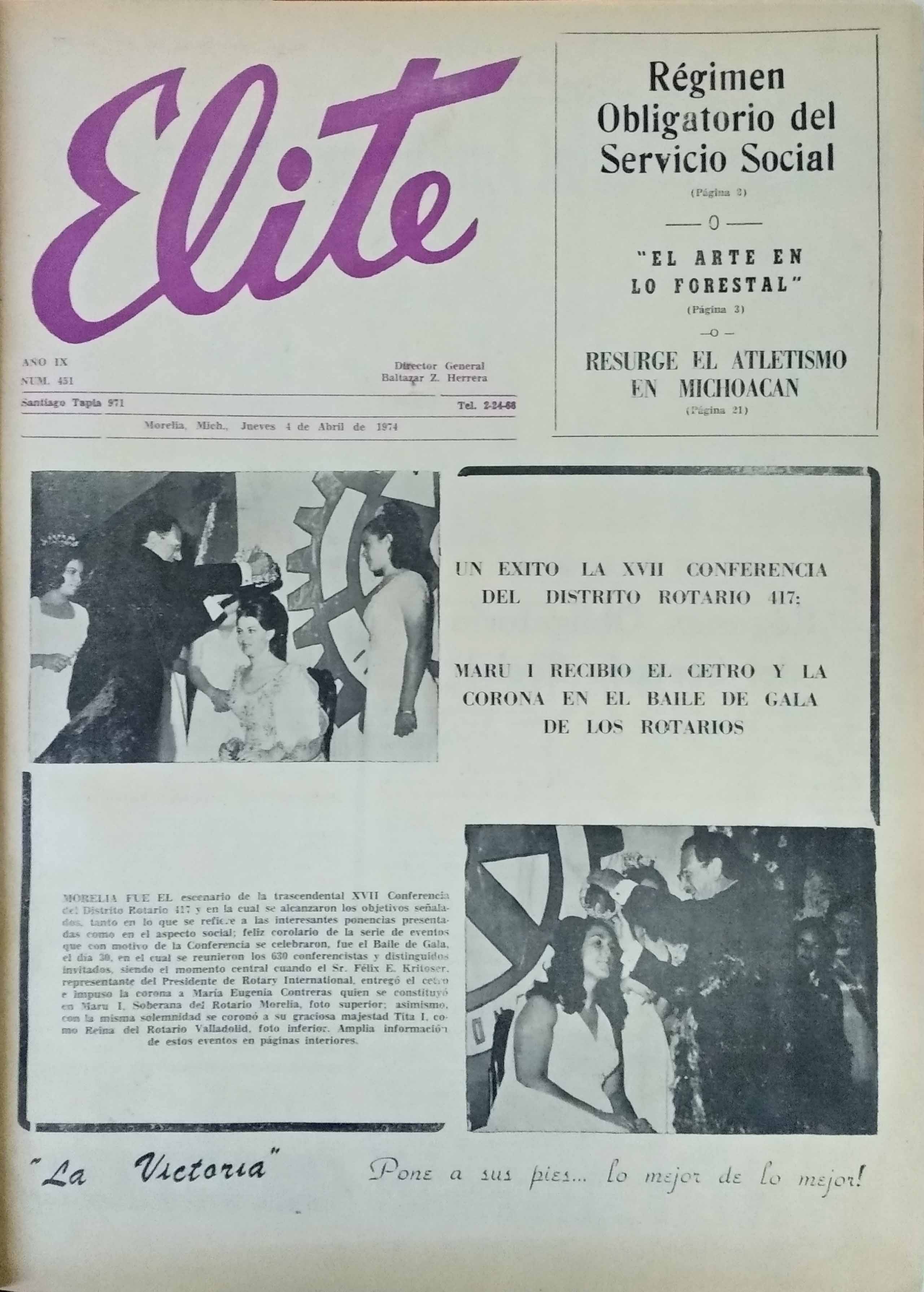 AUTOR: S. A.EDITOR: S. E.EDICIÓN: S. E.AÑO: 1974LUGAR: MORELIA, MICH.PAÍS: S. P.PÁGINAS: TEMARIO: HEMEROTECA. ELITEID: PR7512