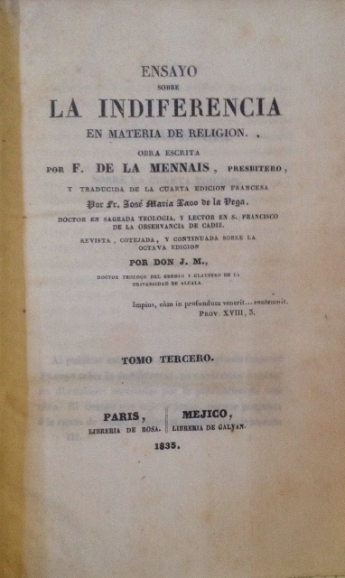ENSAYO SOBRE LA INDIFERENCIA EN MATERIA DE RELIGION. OBRA ESCRITA POR F. DE LA MENNAIS. TOMO TERCERO