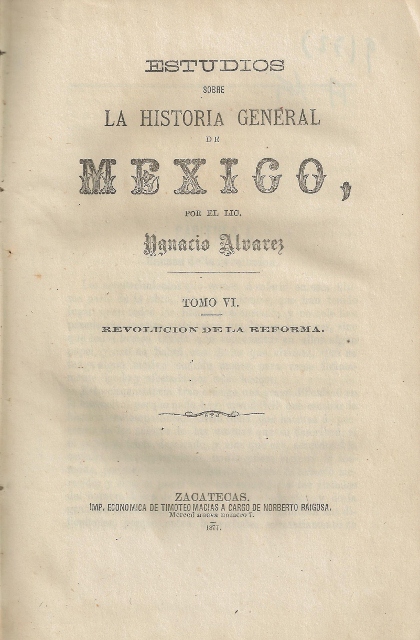 ESTUDIO SOBRE LA HISTORIA GENERAL DE MEXICO. POR EL LIC. IGNACIO ALVAREZ. TOMO VI. REVOLUCION DE LA REFORMA