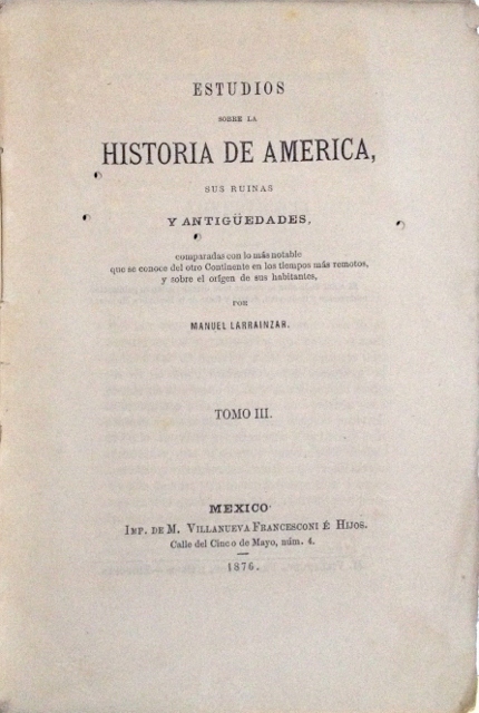 ESTUDIOS SOBRE LA HISTORIA DE AMERICA, SUS RUINAS Y ANTIGUEDADES, COMPARADAS CON LO MAS NOTABLE QUE SE CONOCE DEL OTRO CONTINENTE EN LOS TIEMPOS MAS REMOTOS, Y SOBRE EL ORIGEN DE SUS HABITANTES POR MANUEL LARRAINZAR. TOMO III