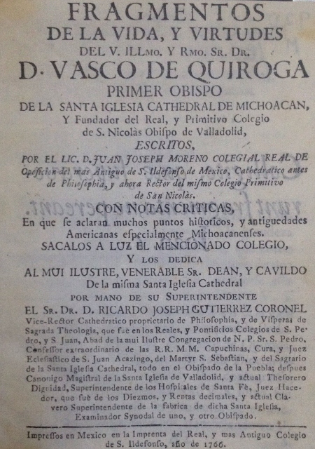 FRAGMENTOS DE LA VIDA Y VIRTUDES DEL V. ILLMO. Y RMO. SR. DR. D. VASCO DE QUIROGA PRIMER OBISPO DE LA SANTA IGLESIA CATHEDRAL DE MICHOACAN, Y FUNDADOR DEL REAL, Y PRIMITIVO COLEGIO DE S. NICOLAS OBISPO DE VALLADOLID, ESCRITO, POR EL LIC. D. JUAN JOSEPH MORENO COLEGIAL REAL DE OPOSICION DEL MAS ANTIGUO DE S. ILDEFONSO DE MEXICO, CATHEDRATICO ANTES DE PHILOSOPHIA, Y AHORA RECTOR DEL MISMO COLIGIO PRIMITIVO DE SAN NICOLAS. REGLAS Y ORDENANZAS PARA EL GOBIERNO DE LOS HOSPITALES DE SANTAFE DE MEXICO, Y MICHOACAN, DISPUESTAS POR SU FUNDADOR EL RMO. Y VENERABLE SR. DON VASCO DE QUIROGA PRIMER OBISPO DE MICHOACAN