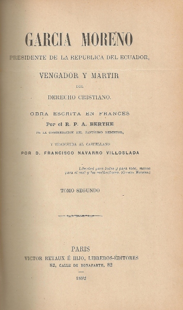 GARCIA MORENO PRESIDENTE DE LA REPUBLICA DEL ECUADOR, VENGADOR Y MARTIR DEL DERECHO CRISTIANO. OBRA ESCRITA EN FRANCES POR EL R. P. A. BERTHE DE LA CONGRAGACION DEL SANTISIMO REDENTOR, Y TRADUCIDA AL CASTELLANO POR D. FRANCISCO NAVARRO VILLOSLADA. TOMO SEGUNDO