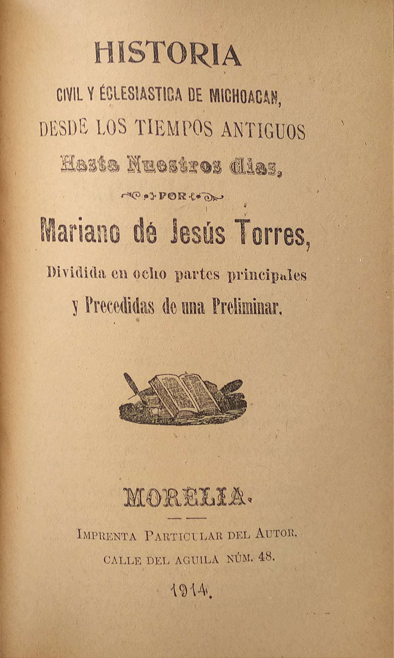 HISTORIA CIVIL Y ECLESIASTICA DE MICHOACAN DESDE LOS TIEMPOS ANTIGUOS HASTA NUESTROS DIAS POR MARIANO DE JESUS TORRES, DIVIDIDA EN OCHO PARTES PRINCIPALES Y PRECEDIDAS DE UNA PRELIMINAR