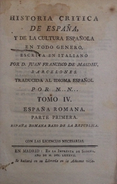 HISTORIA CRITICA DE ESPAÑA, Y DE LA CULTURA ESPAÑOLA EN TODO EL GENERO, ESCRITA EN ITALIANO POR D. JUAN FRANCISCO DE MASDEU, BARCELONES. TRADUCCION AL IDIOMA ESPAÑOL POR N N TOMO IV. ESPAÑA ROMANA. PARTE PRIMERA. ESPAÑA ROMANA BAXO DE LA REPUBLICA