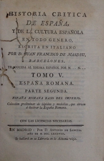 HISTORIA CRITICA DE ESPAÑA, Y DE LA CULTURA ESPAÑOLA EN TODO EL GENERO, ESCRITA EN ITALIANO POR D. JUAN FRANCISCO DE MASDEU, BARCELONES. TRADUCCION AL IDIOMA ESPAÑOL POR N N TOMO V. ESPAÑA ROMANA. PARTE SEGUNDA. ESPAÑA ROMANA BAXO DEL IMPERIO. COLECCION PRELIMINAR DE LAPIDAS Y MEDALLAS, QUE SIRVEN A ILUSTRAR LA ESPAÑA ROMANA