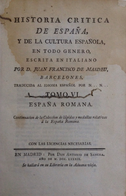 HISTORIA CRITICA DE ESPAÑA, Y DE LA CULTURA ESPAÑOLA, EN TODO EL GENERO, ESCRITA EN ITALIANO POR D. JUAN FRANCISCO DE MASDEU, BARCELONES, TRADUCCION AL IDIOMA ESPAÑOL POR N N TOMO VI. ESPAÑA ROMANA. CONTINUACION DE LA COLECCION DE LAPIDAS Y MEDALLAS RELATIVAS A LA ESPAÑA ROMANA