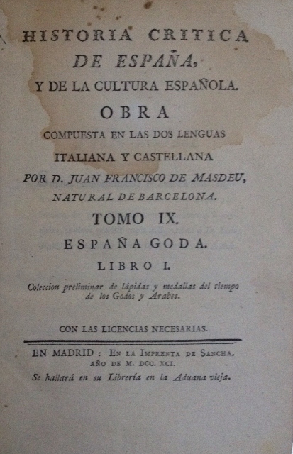 HISTORIA CRITICA DE ESPAÑA, Y DE LA CULTURA ESPAÑOLA. OBRA COMPUESTA EN ITALIANO Y EN CASTELLANO POR D. JUAN FRANCISCO DE MASDEU, NATURAL DE BARCELONA. TOMO IX. ESPAÑA GODA. LIBRO I. COLECCION PRELIMINAR DE LAPIDAS Y MEDALLAS DE TIEMPO DE LOS GODOS Y ARABES