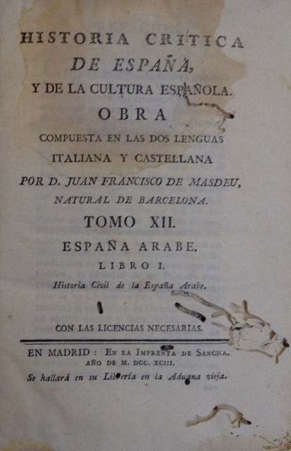 HISTORIA CRITICA DE ESPAÑA, Y DE LA CULTURA ESPAÑOLA. OBRA COMPUESTA EN LAS DOS LENGUAS ITALIANA Y CASTELLANA POR D. JUAN FRANCISCO DE MASDEU, NATURAL DE BARCELONA. TOMO XII. ESPAÑA ARABE. LIBRO I. HISTORIA CIVIL DE LA ESPAÑA ARABE