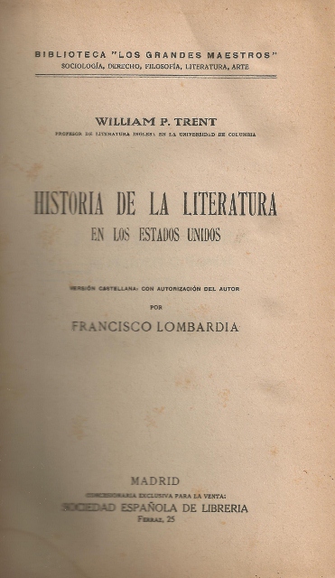 AUTOR: TRENT (WILLIAM P.)EDITOR: SOCIEDAD ESPAÑOLA DE LIBRERIAEDICIÓN: S. E.AÑO: S. A.LUGAR: MADRIDPAÍS: S. P.PÁGINAS: 384 PP.TEMARIO: LITERATURA MUNDIALID: 4461