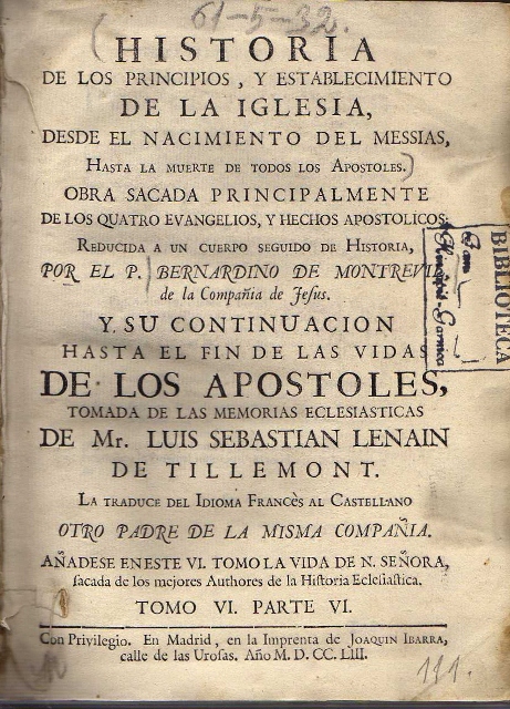 HISTORIA DE LOS PRINCIPIOS, Y ESTABLECIMIENTO DE LA IGLESIA, DESDE EL NACIMIENTO DEL MESSIAS, HASTA LA MUERTE DE TODOS LOS APOSTOLES. OBRA SACADA PRINCIPALMENTE DE LOS QUATRO EVANGELIOS, Y HECHOS APOSTOLICOS: REDUCIDA A UN CUERPO SEGUIDO DE HISTORIA, POR EL P. BERNARDINO DE NONTREVIL DE LA COMPAÑIA DE JESUS. Y SU CONTINUACION HASTA EL FIN DE LAS VIDAS DE LOS APOSTOLES, TOMADA DE LAS MEMORIAS ECLESIASTICAS DE MR. LUIS SEBASTIAN LENAIN DE TILLEMONT. TOMO VI. PARTE VI.