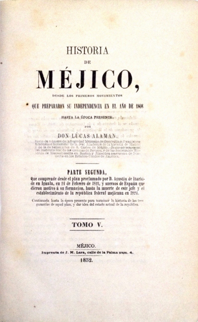 HISTORIA DE MEJICO DESDE LOS PRIMEROS MOVIMIENTOS QUE PREPARARON SU INDEPENDENCIA EN EL AÑO DE 1808 HASTA LA EPOCA PRESENTE. POR DON LUCAS ALAMAN. PARTE SEGUNDA, QUE COMPRENDE DESDE EL PLAN PROCLAMADO POR D. AGUSTIN DE ITURBIDE EN IGUALA, EN 24 DE FEBRERO DE 1821, Y SUCESOS DE ESPAÑA QUE DIERON MOTIVO A SU FORMACION, HASTA LA MUERTE DE ESTE JEFE Y EL ESTABLECIMIENTO DE LA REPUBLICA FEDERAL MEJICANA EN 1824. CONTINUADA HASTA LA EPOCA PRESENTE PARA TERMINAR LA HISTORIA DE LAS TRES GARANTIAS DE AQUEL PLAN, Y DAR IDEA DEL ESTADO ACTUAL DE LA REPUBLICA. TOMO V
