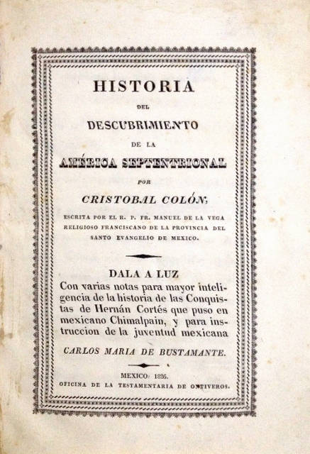 HISTORIA DEL DESCUBRIMIENTO DE LA AMERICA SEPTENTRIONAL POR CRISTOBAL COLON, ESCRITA POR EL R. P. FR. MANUEL DE LA VEGA RELIGIOSO FRANCISCANO DE LA PROVINCIA DEL SANTO EVANGELIO DE MEXICO. DALA A LA LUZ CON VARIAS NOTAS PARA MAYOR INTELIGENCIA DE LA HISTORIA DE LA CONQUISTAS DE HERNAN CORTES QUE PUSO EL MEXICANO CHIMALPAIN Y PARA INSTRUCCION DE LA JUVENTUD MEXICANA CARLOS MARIA DE BUSTAMANTE