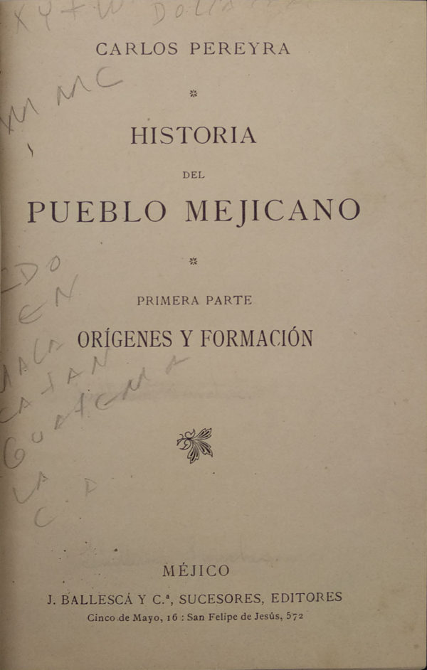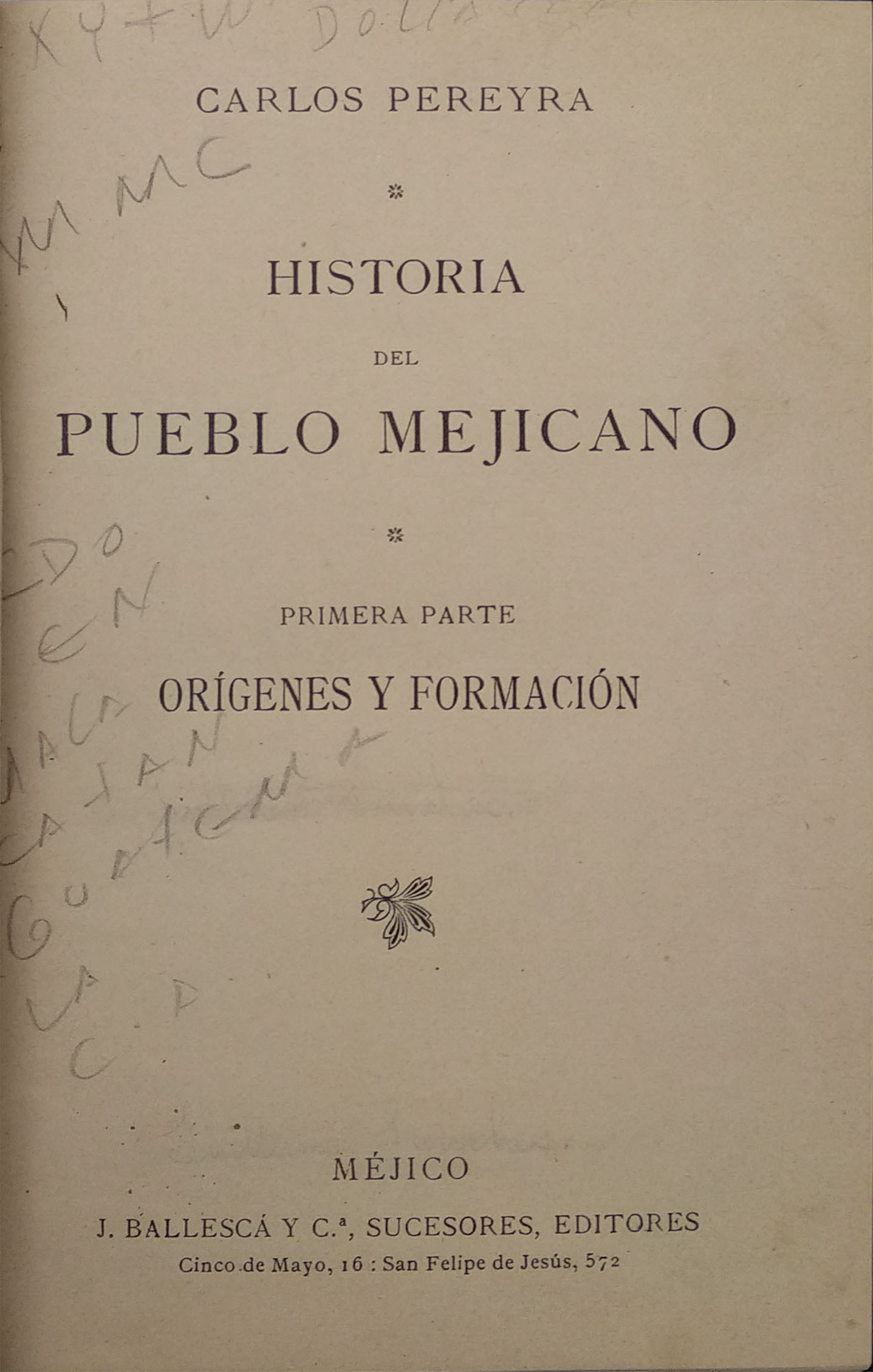 AUTOR: PEREYRA (CARLOS)EDITOR: J. BALLESCA Y C. SUCESORESEDICIÓN: S. E.AÑO: S. A.LUGAR: MEJICOPAÍS: MEXICOPÁGINAS: 195 PP.TEMARIO: HISTORIA GENERAL DE MEXICOID: 3836