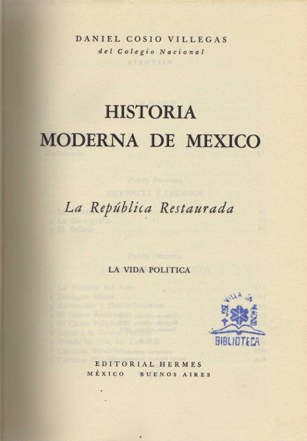 AUTOR: COSIO VILLEGAS (DANIEL)EDITOR: HERMESEDICIÓN: TERCERA EDICIONAÑO: 1973LUGAR: MEXICO, D. F.PAÍS: MEXICOPÁGINAS: 979 PP.TEMARIO: HISTORIA GENERAL DE MEXICOID: 4119