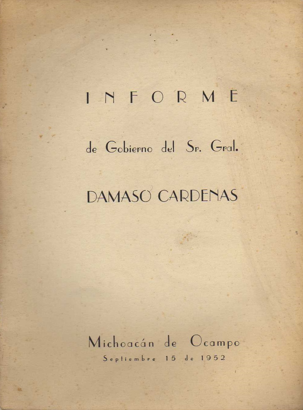 AUTOR: S. A.EDITOR: MICHOACAN DE OCAMPOEDICIÓN: S. E.AÑO: 1952LUGAR: MORELIA, MICHOACANPAÍS: MEXICOPÁGINAS: 32 PP.TEMARIO: MICHOACAN. INFORMESID: M984
