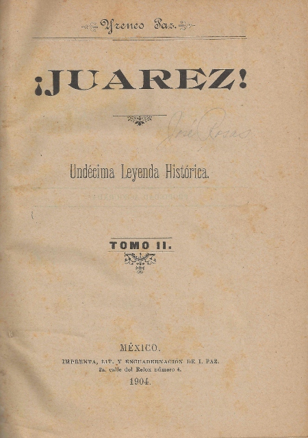 AUTOR: PAZ (IRENEO)EDITOR: IMPRENTA, LIT. Y ENCUADERNACION DE I. PAZEDICIÓN: S. E.AÑO: 1904LUGAR: S. L.PAÍS: MEXICOPÁGINAS: 323 PP.TEMARIO: ANTIGUO. JUAREZID: 11.066