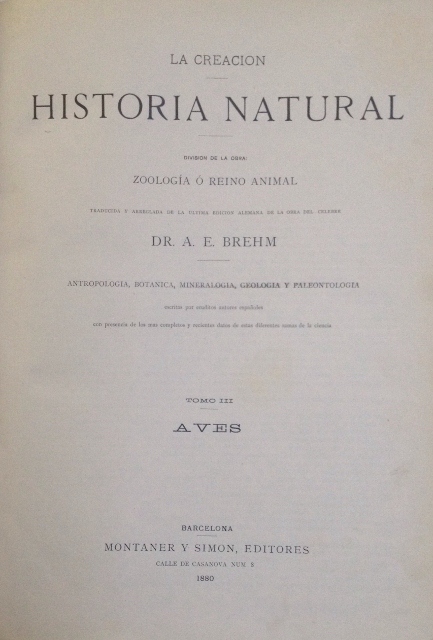 LA CREACION. HISTORIA NATURAL. DIVISION DE LA OBRA: ZOOLOGIA O REINO ANIMAL TRADUCIDA Y ARREGLADA DE LA ULTIMA EDICION ALEMANA DE LA OBRA DEL CELEBRE DR. A. E. BREHM. TOMO III. AVES