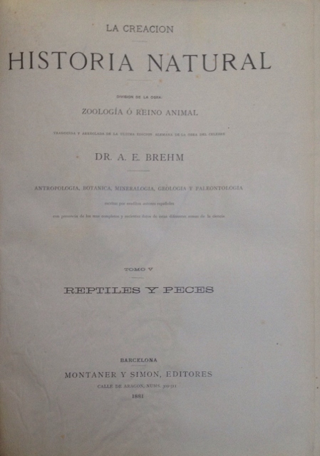LA CREACION. HISTORIA NATURAL. DIVISION DE LA OBRA: ZOOLOGIA O REINO ANIMAL TRADUCIDA Y ARREGLADA DE LA ULTIMA EDICION ALEMANA DE LA OBRA DEL CELEBRE DR. A. E. BREHM. TOMO V. REPTILES Y PECES