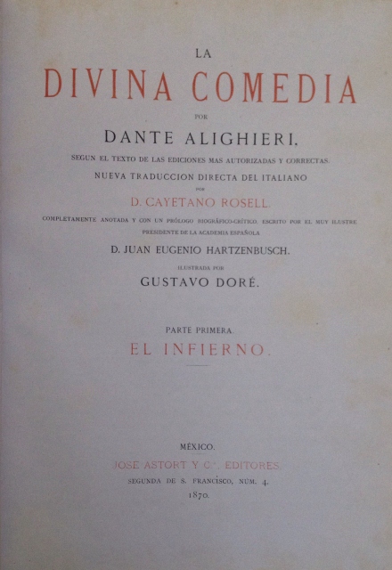 LA DIVINA COMEDIA POR DANTE ALIGHIERI, SEGUN EL TEXTO DE LAS EDICIONES MAS AUTORIZADAS Y CORRECTAS. NUEVA TRADUCCION DIRECTA DEL ITALIANO POR D. CAYETANO ROSELL. COMPLETAMENTE ANOTADA Y CON UN PROLOGO BIOGRAFICO – CRITICO, ESCRITO POR EL MUY ILUSTRE PRESIDENTE DE LA ACADEMIA ESPAÑOLA D. JUAN EUGENIO HAZTZENBUSCH. ILUSTRADA POR GUSTAVE DORE. PARTE PRIMETA. EL INFIERNO