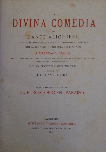 LA DIVINA COMEDIA POR DANTE ALIGHIERI, SEGUN EL TEXTO DE LAS EDICIONES MAS AUTORIZADAS Y CORRECTAS. NUEVA TRADUCCION DIRECTA DEL ITALIANO POR D. CAYETANO ROSELL. COMPLETAMENTE ANOTADA Y CON UN PROLOGO BIOGRAFICO – CRITICO, ESCRITO POR EL MUY ILUSTRE PRESIDDENTE DE LA ACADEMIA ESPAÑOLA D. JUAN EUGENIO HARTZENBUSCH. ILUSTRADA POR GUSTAVO DORE. PARTE SEGUNDA Y TERCERA. EL PURGATORIO.- EL PARAISO
