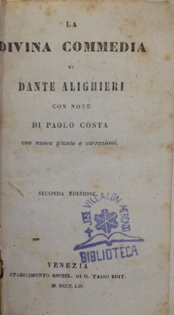 AUTOR: ALIGHIERI (DANTE)EDITOR: STABILIMENTO ENCICL. DI G. TASSO EDIT.EDICIÓN: S. E.AÑO: 1852LUGAR: VENEZIAPAÍS: S. P.PÁGINAS: XII PP. (EN ROMANO) Y 816 PP. (EN ARABIGO)TEMARIO: ANTIGUO. RELIGIONID: 64.A