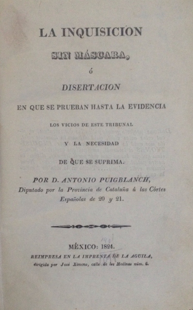 LA INQUISICION SIN MASCARAS, O DISERTACION EN QUE SE PRUEBAN HASTA LA EVIDENCIA. LOS VICIOS DE ESTE TRIBUNAL Y LA NECESIDAD DE QUE SE SUPRIMA. POR D. ANTONIO PUIGBLANCH, DIPUTADO POR LA PROVINCIA DE CATALUÑA A LAS CORTES ESPAÑOLAS DE 20 Y 21