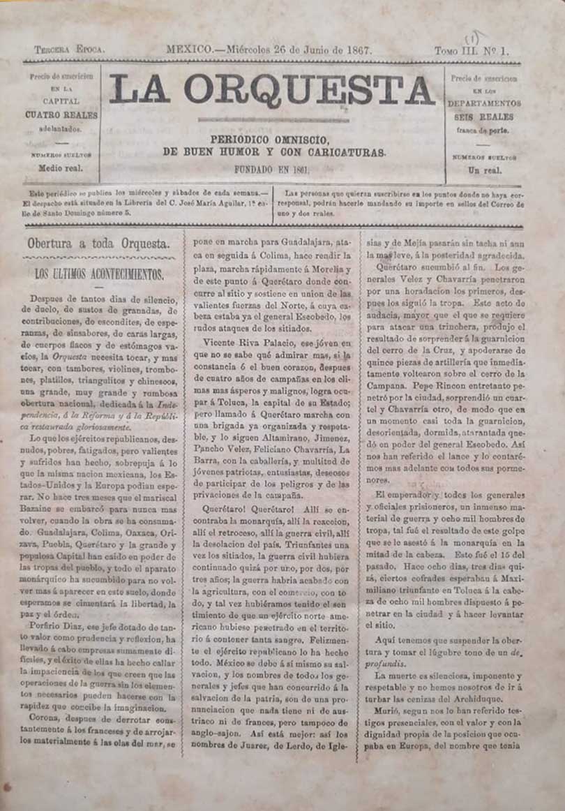 LA ORQUESTA. PERIODICO OMNISIO, DE BUEN HUMOR Y CON CARICATURAS. FUNDADO EN 1861. TERCERA EPOCA. N° 1. TOMO I (TIENE TOMO III). MEXICO, MIERCOLES 26 DE JUNIO DE 1867 AL N° 106. TOMO I. MEXICO, SABADO 27 DE JUNIO DE 1868
