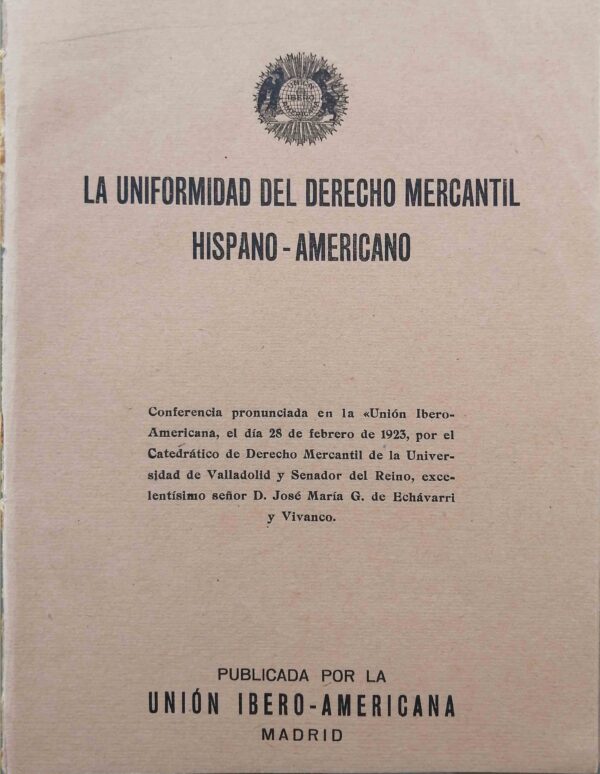 LA UNIFORMIDAD DEL DERECHO MERCANTIL. HISPANO – AMERICANO. CONFERENCIA PRONUNCIADA EN LA UNION IBERO-AMEROCANA, EL DIA 28 DE FEBRERO DE 1923, POR EL CATEDRATICO DE DERECHO MERCANTIL DE LA UNIVERSIDAD DE VALLADOLID Y SENADOR DEL REINO, EXCELENTISIMO SEÑOR D. JOSE MARIA G. DE ECHAVARRI Y VIVANCO