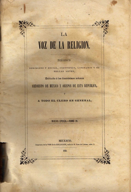 LA VOZ DE LA RELIGION. PERIODICO RELIGIOSO Y SOCIAL, CIENTIFICO, LITERARIO Y DE BELLAS ARTES, DEDICADO A LOS ILUSTRISIMOS SEÑORES ARZOBISPO DE MEXICO Y OBISPOS DE ESTA REPUBLICA, Y A TODO EL CLERO EN GENERAL. NUEVA EPOCA. TOMO III. NUM. 1 – 26.