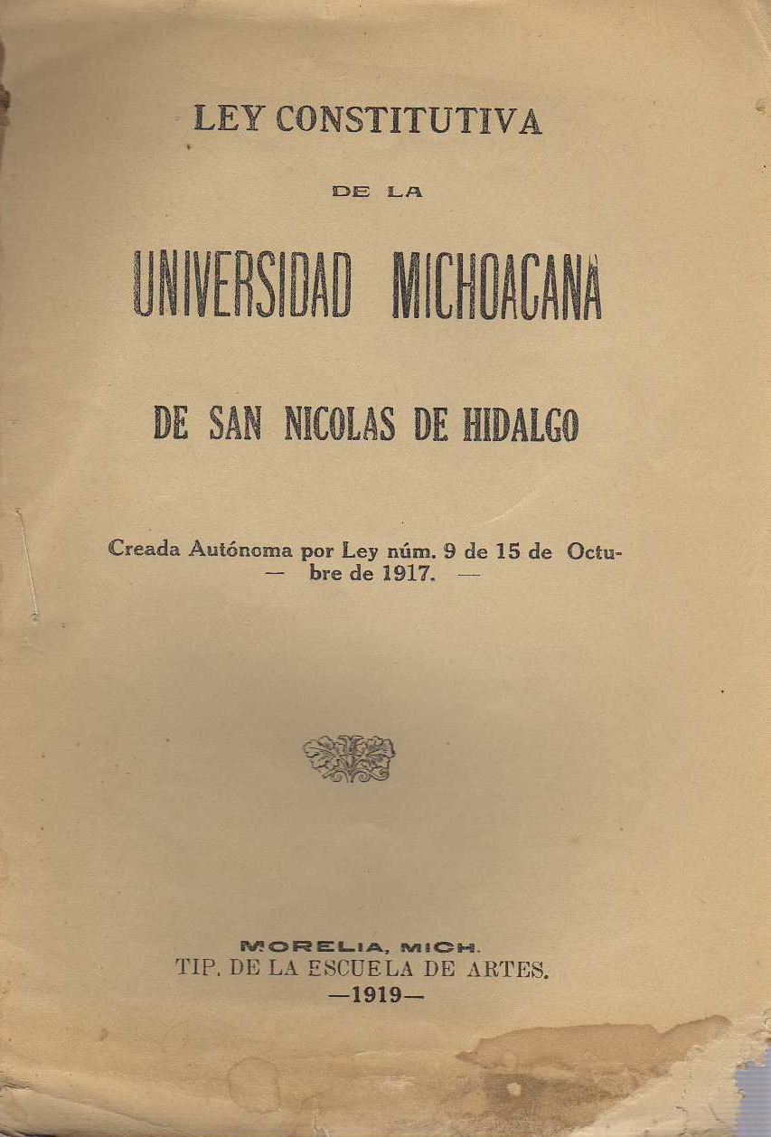 LEY CONSTITUTIVA DE LA UNIVERSIDAD MICHOACANA DE SAN NICOLAS DE HIDALGO. CREADA AUTONOMA POR LEY NUM. 9 DE 15 DE OCTUBRE DE 1917