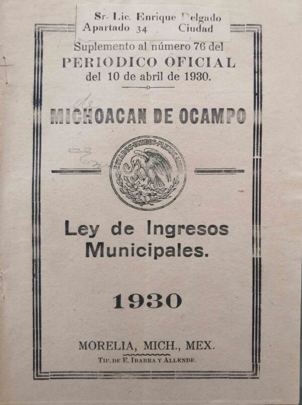 LEY DE INGRESOS MUNICIPALES 1930. SR. LIC. ENRIQUE DELGADO SUPLEMENTO AL NUMERO 76 DEL PERIODICO OFICIAL DEL 10 DE ABRIL DE 1930. MICHOACAN DE OCAMPO