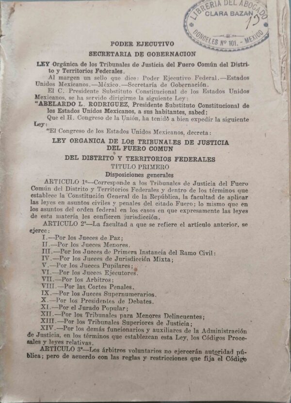LEY ORGANICA DE LOS TRIBUNALES DE JUSTICIA DEL FUERO COMUN DEL DISTRITO Y TERRITORIOS FEDERALES. PODER EJECUTIVO. SECRETARIA DE GOBERNACION