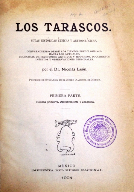 LOS TARASCOS. NOTAS HISTORICAS ETNICAS Y ANTROPOLOGICAS, COMPRENDIENDO DESDE LOS TIEMPOS PRECOLOMBINOS HASTA LOS ACTUALES, COLEGIDAS DE ESCRITORES ANTIGUOS Y MODERNOS, DOCUMENTOS INEDITOS Y OBSERVACIONES PERSONALES, POR EL DR. NICOLAS LEON. PRIMERA PARTE. HISTORIA PRIMITIVA, DESCUBRIMIENTO Y CONQUISTA
