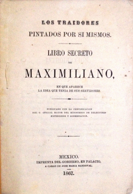 LOS TRAIDORES PINTADOS POR SI MISMOS. LIBRO SECRETO DE MAXIMILIANO, EN QUE APARECE LA IDEA QUE TENIA DE SUS SERVIDORES. PUBLICADO CON LA CERTIFICACION DEL C. OFICIAL MAYOR DEL MINISTERIO DE RALACIONES EXTERIORES Y GOBERNACION