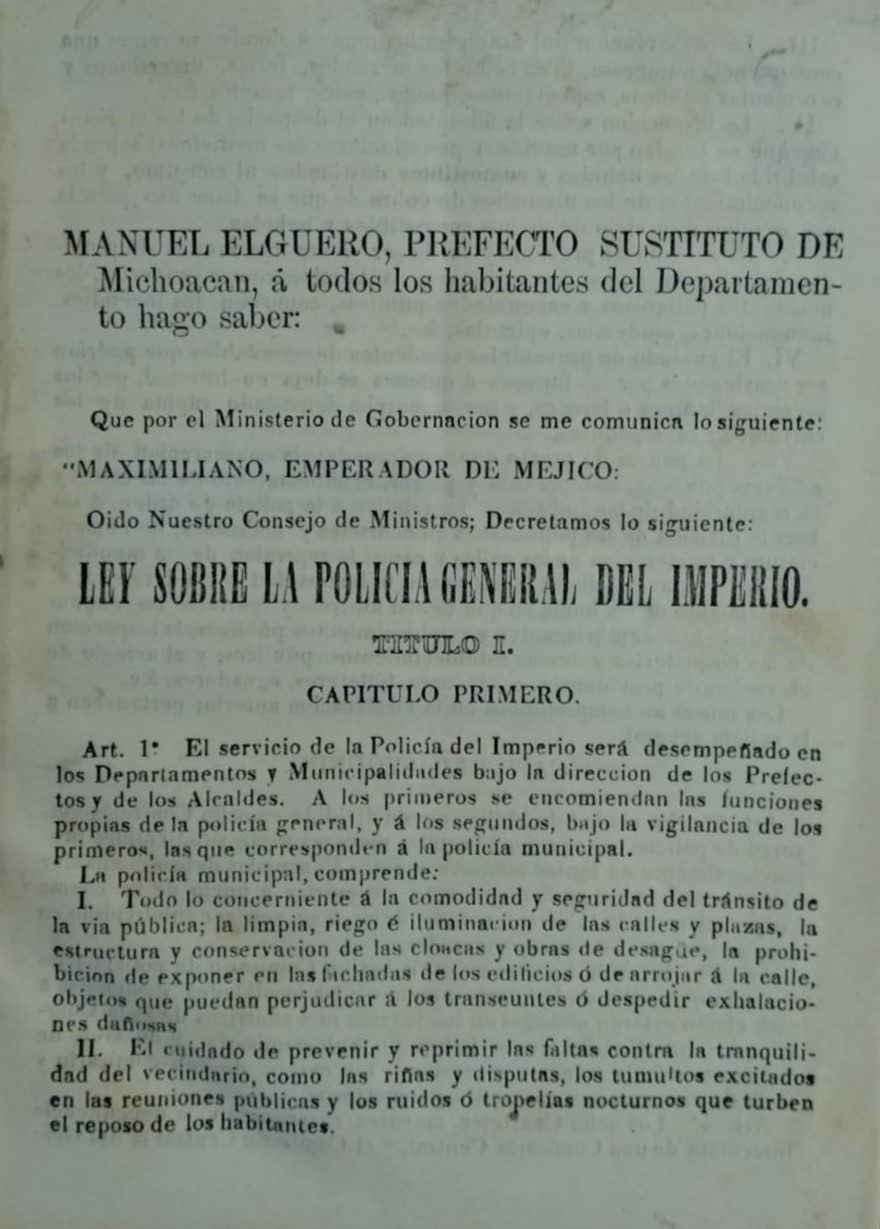 MANUEL ELGUERO, PREFECTO SUSTITUTO DE MICHOACAN, A TODOS LOS HABITANTES DEL DEPARTAMENTO HAGO SABER: QUE POR EL MINISTERIO DE GOBERNACION SE ME COMUNICA LO SIGUIENTE: MAXIMILIANO, EMPERADOR DE MEJICO: OIDO NUESTRO CONSEJO DE MINISTROS; DECRETAMOS LO SIGUIENTE: LEY SOBRE LA POLITICA GENERAL DEL IMPERIO.