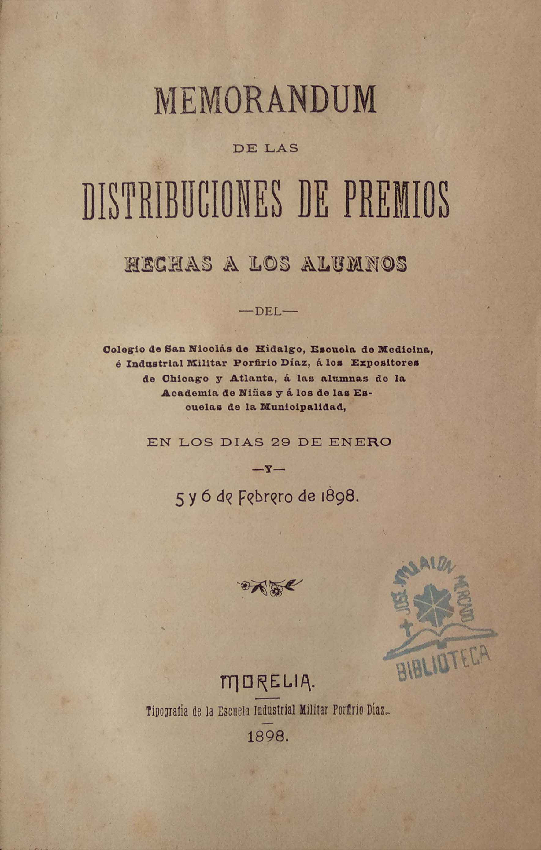 MEMORANDUM DE LAS DISTRIBUCIONES DE PREMIOS HECHAS A LOS ALUMNOS DEL COLEGIO DE SAN NICOLAS DE HIDALGO, ESCUELA DE MEDICINA E INDUSTRIAL MILITAR PORFIRIO DIAZ, A LOS EXPOSITORES DE CHICAGO Y ATLANTA, A LAS ALUMNAS DE LA ACADEMIA DE NIÑAS Y A LOS DE LAS ESCUELAS DE LA MUNICIPALIDAD, EN LOS DIAS 29 DE ENERO Y 5 Y 6 DE FEBRERO DE 1898