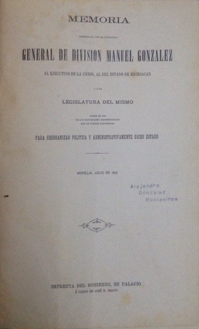 MEMORIA. PRESENTADA POR EL CIUDADANO GENERAL DE DIVISION MANUEL GONZALEZ AL EJECUTIVO DE LA UNION, AL DEL ESTADO DE MICHOACAN Y A LA LEGISLATURA DEL MISMO SOBRE EL USO DE LAS FACULTADES DISCRECIONALES QUE LE FUERON CONCEDIDAS PARA REORGANIZAR POLITICA Y ADMINISTRATIVAMENTE DICHO ESTADO