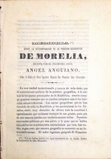 MEMORIA SOBRE LA DETERMINACION DE LA POSICION GEOGRAFICA DE MORELIA, ESCRITA POR EL INGENIERO CIVIL ANGEL ANGUIANO, QUIEN LA DEDICA AL SEÑOR INGENIERO GEOGRAFO DON FRANCISCO DIAZ COVARRUBIAS