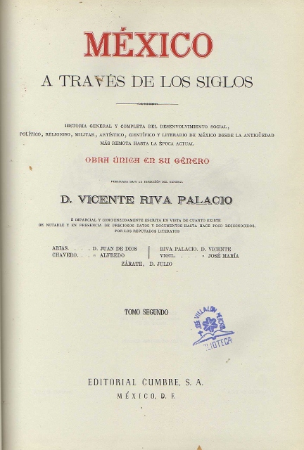 AUTOR: RIVA PALACIO (VICENTE) EDITOR: CUMBRE EDICIÓN: DECIMOSEPTIMA EDICION AÑO: S. A. LUGAR: MEXICO, D. F. PAÍS: E.U.A. PÁGINAS: 455 PP. TEMARIO: HISTORIA GENERAL DE MEXICO ID: 4084